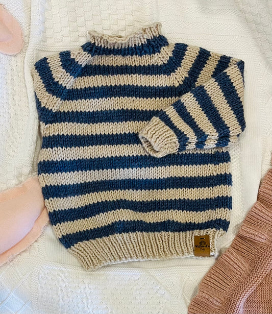 HAND KNITTED JUMPER - BEIGE AND NAVY STRIPE