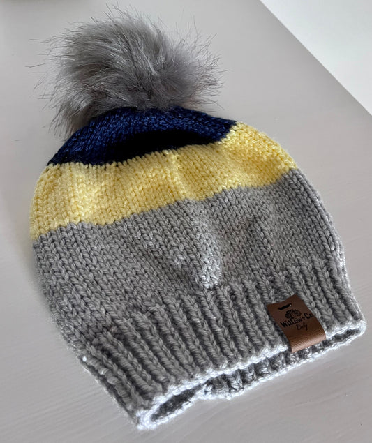 HAND KNITTED BEANIE - GREY, YELLOW & NAVY